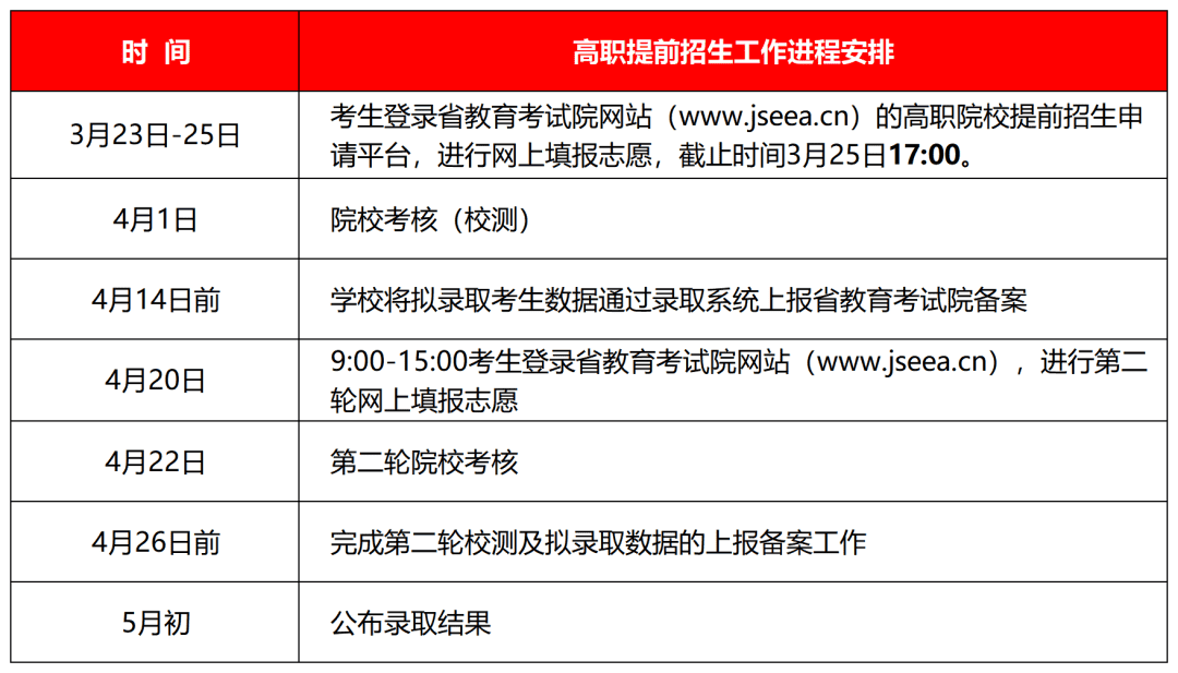 第一轮:2023年3月23日至25日(3月23日8:30开始,3月25日17:00截止),考生登录省教育考试院网站(www.jseea.cn)的高职院校提前招生申请平台,进行网上报名。